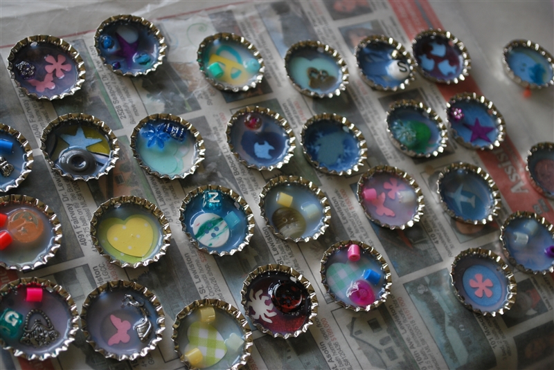 I cut 1 inch circles from my scrap stash of paper. (I have a hard time throwing anything away, so I have a lot this!) We just lined them up in the bottle caps, then cut out small paper shapes or added a bead or button or two. Then we added the Dimensional Magic to all the bottle caps. Finally, when it has dried for 24 hours, we used E6000 to glue magnets and pins to the backs.